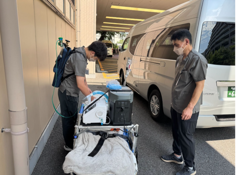 事前に退院前カンファレンスにドコケアも参加させていただきました。高度な医療的ケアの必要な搬送の場合には極力カンファレンスに参加させていただけるようにしています。失敗が許されない搬送では、ソーシャルワーカー、病棟看護師訪問診療チームやケアマネジャーとの密な連携が必須です。機器の調整や当日の段取りを丁寧に確認しました。